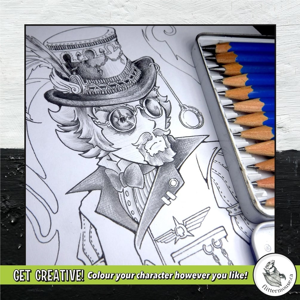 Get creative with this fun, print-at-home colouring page! This steampunk-ish character was great fun to draw, but his stylish accessories need some colour! How will you jazz up his look?